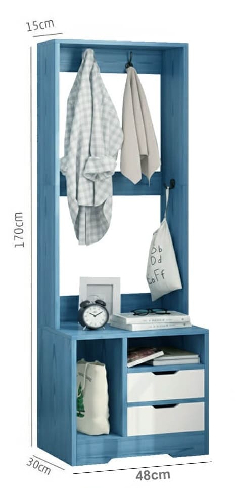 The Wooden 3 Drawers Cabinet provides a perfect blend of storage and style. Designed with three spacious drawers for organizing clothes, accessories, and essentials, it also includes a hanging section with hooks, ideal for coats, bags, and scarves. Its compact yet functional design makes it suitable for bedrooms, living rooms, or entryways.